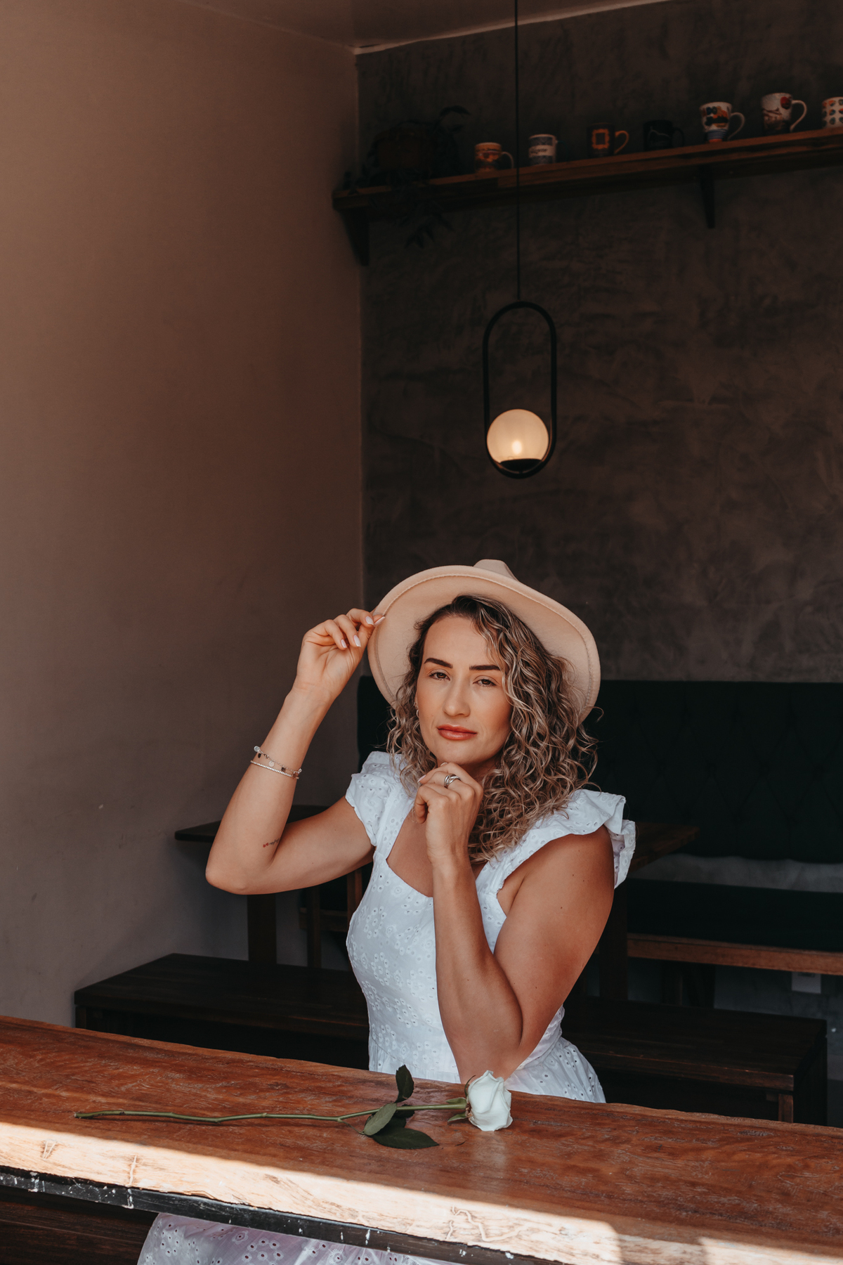 ensaio feminino em um café